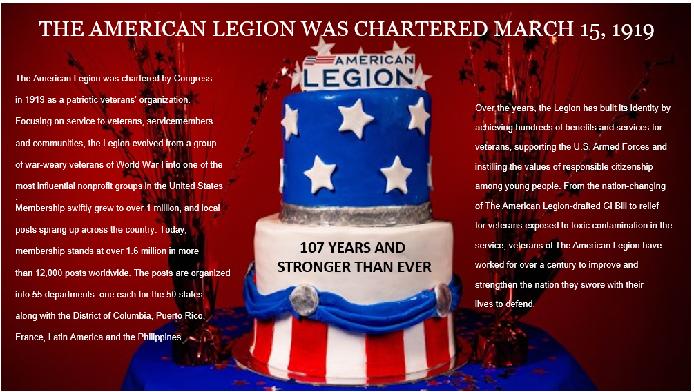 The American Legion was chartered and incorporated by Congress in 1919 as a patriotic veterans organization devoted to mutual helpfulness. It's the nation's largest veterans service organization. We are committed to mentoring and sponsorship of wholesome programs in our communities. Advocate patriotism, honor, promote strong national security, and continued devotion to our fellow service members and veterans. In times of crisis, the American Legion advocates for veterans. Our mission is to enhance the well-being of American Veterans. The American Legion's success depends entirely on active membership, participation and volunteerism. The organization belongs to the people it serves and the communities in which it thrives.